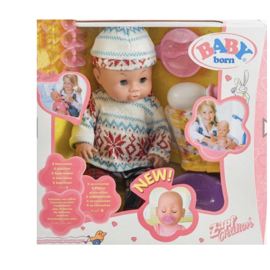 عروسة بيبي بورن متوفر اشكال من الملابس المختلفة مع اغراض العروسة تعمل بدون بطارية