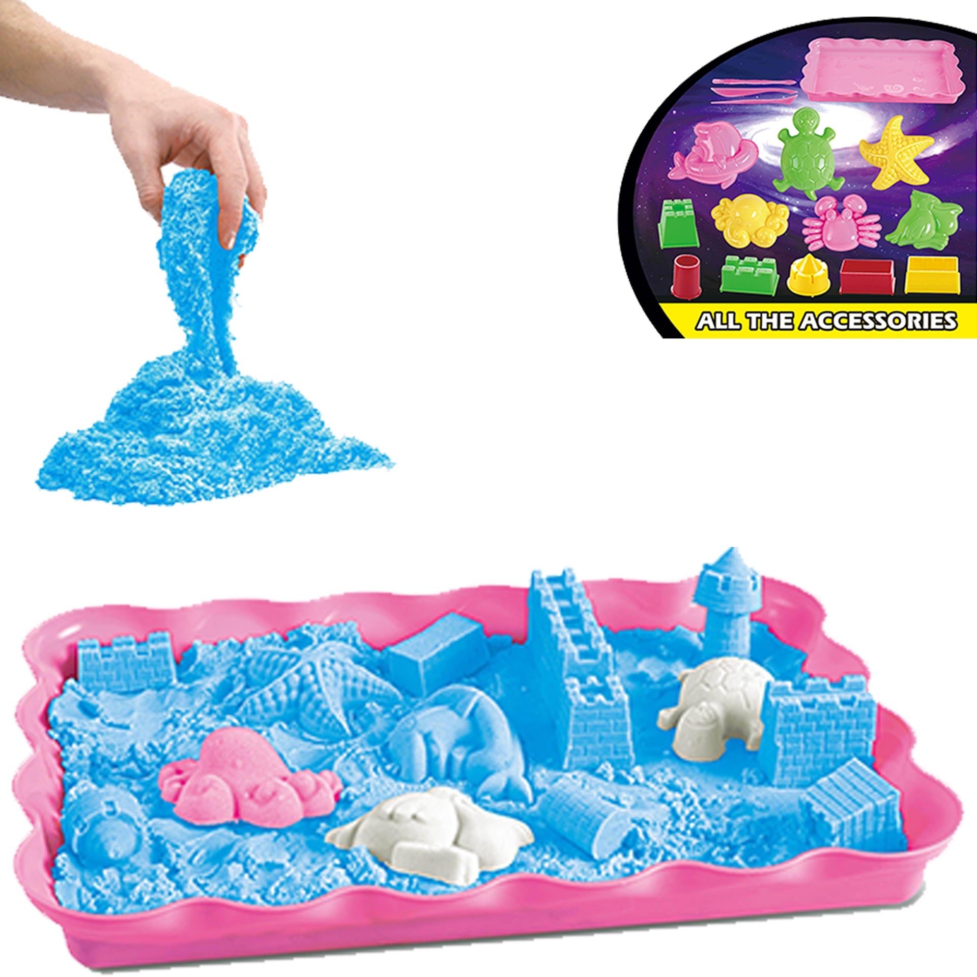 تشمل: 750 جرام رمال سحرية ، قوالب رمل بلاستيكية متعددة ، وصينية رمل بلاستيكية واحدة