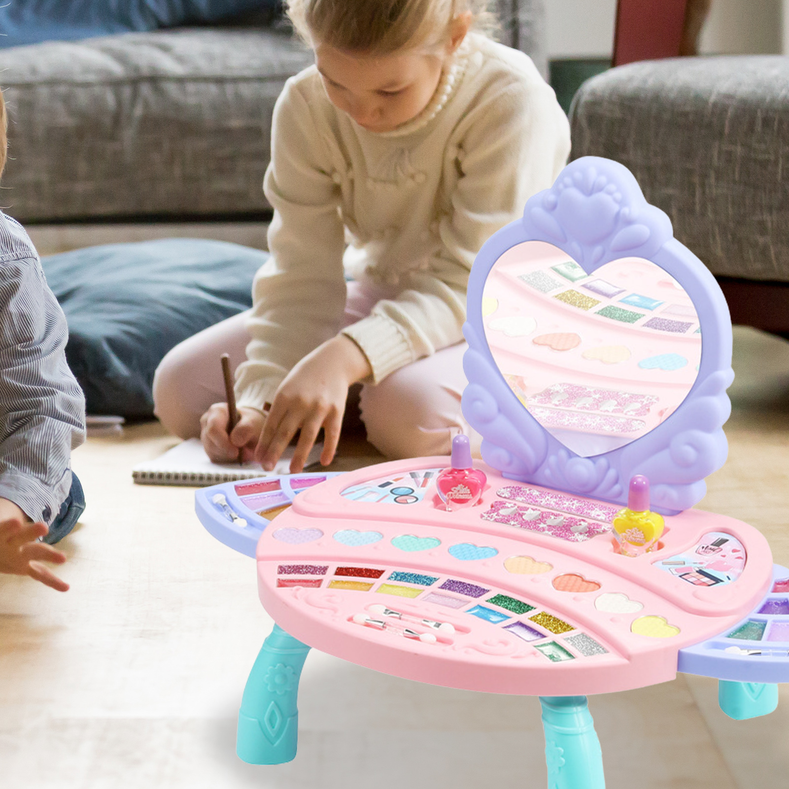 طاولة المكياج مع مرآةمع ادوات تزين الطاولة مزودة بآلوان مختلفة من المكياج الرائع للآطفال مع مرآة كبيرة مع فرشاة ميكاب بديكير ومنكير دع اطفالك يلعبون بآمان مع طاولة المكياج المخصصة لهم
