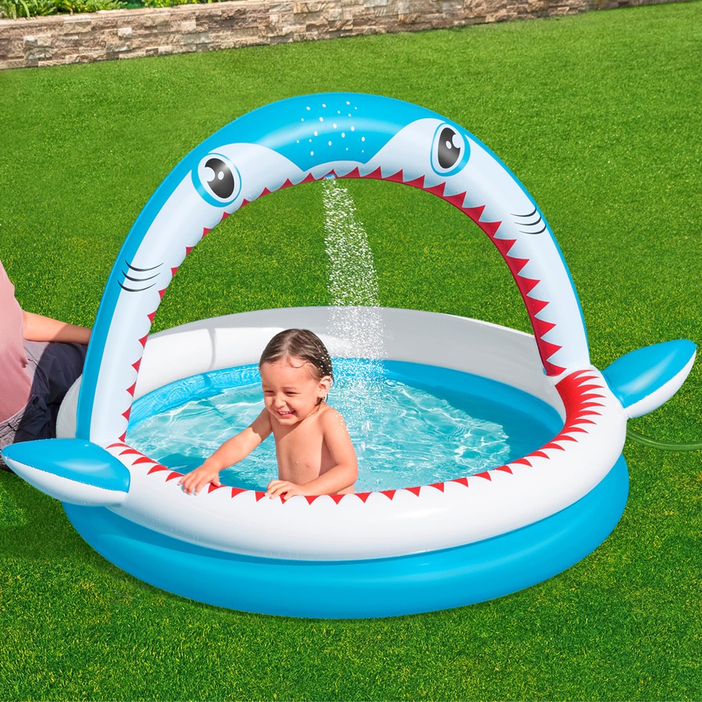 المقاس: بعد النفخ ١٦٣ × ١٢٧ × ٩٢ سم، القطر غير المنفوخ ١١٤ سم، سعة الماء ١٣٠ لترًا.مصنوع من بلاستيك بي في سي متين، حلقتان هوائيتان متساويتان الحجم، و٣ حجرات هوائية للثبات.متعة مائية للأطفال الصغار: مناسبة للأعمار من سنتين فما فوق، بتصميم مرح على شكل سمكة قرش.قوس مزود برشاش مياه مدمج مع خرطوم حديقة.المحتويات: مسبح صغير، رقعة إصلاح.