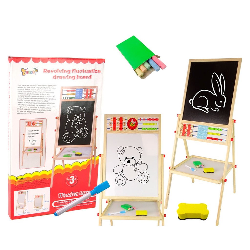 سبورة خشبية كبيرة ذات وجهين مع ملحقاتها هي لعبة تعليمية للأطفال من سن 3 سنوات. اللوح مغناطيسي من جهة والطباشير الأسود من جهة أخرى. الجانب الأبيض مخصص للكتابة بالقلم المرفق. يحتوي القلم على مغناطيس بحيث يمكن تثبيته على السبورة وممحاة. يمكنك الطلاء على الجانب الأسود باستخدام الطباشير الموجود في المجموعة، ثم مسح كل شيء باستخدام الإسفنجة. يمكن تركيب اللوحة في موقعين، أقل وأعلى.اللعب باللوحة له تأثير إيجابي على المهارات اليدوية والتركيز والخيال.
