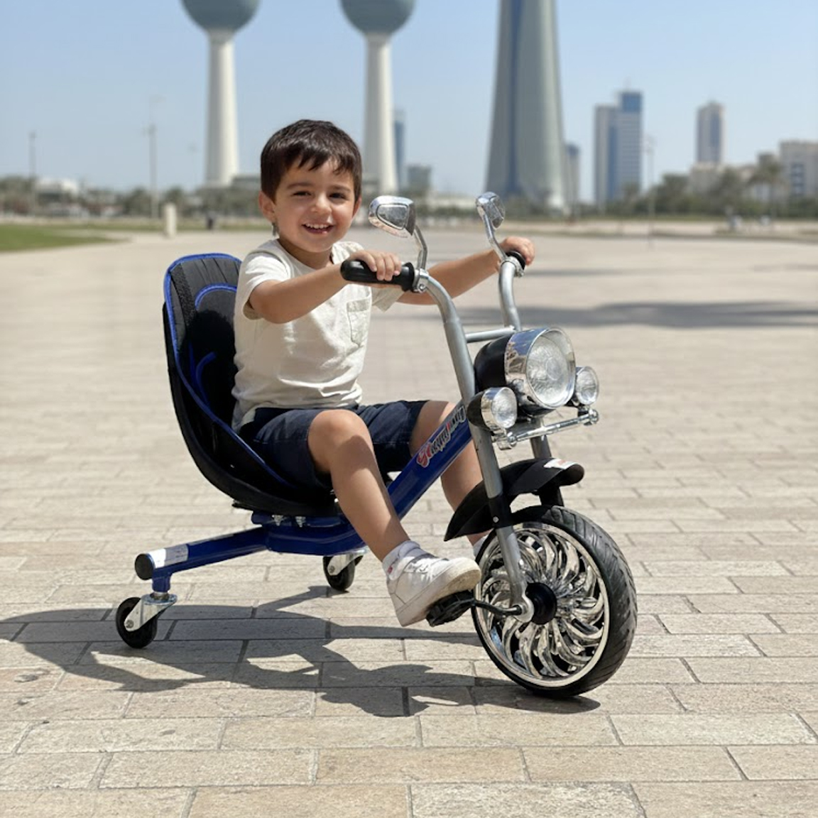 القاري المميز دراجة ثلاثية باللون الازرق و الوردي للأطفال بتصميم موتوسيكل عصري، فيها بدال بالتاير، وكشافات تشغل موسيقي واضاءة ، ومرايات . القعدة مريحة وحزام الأمان