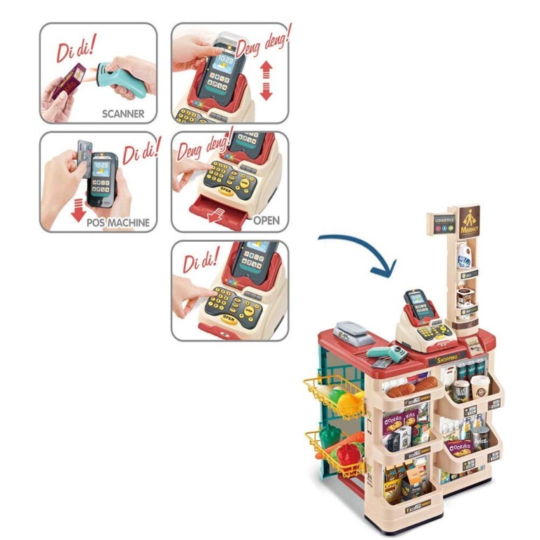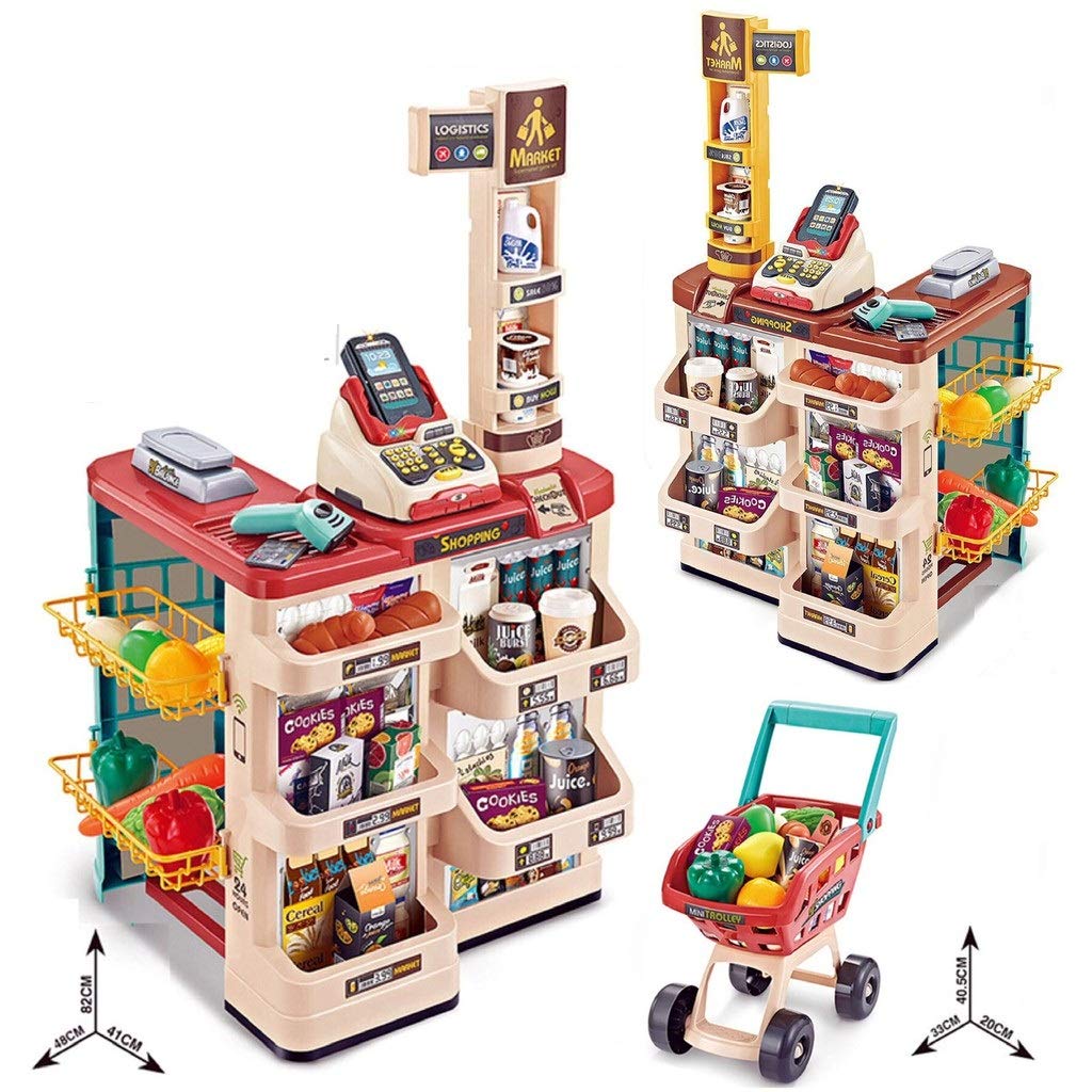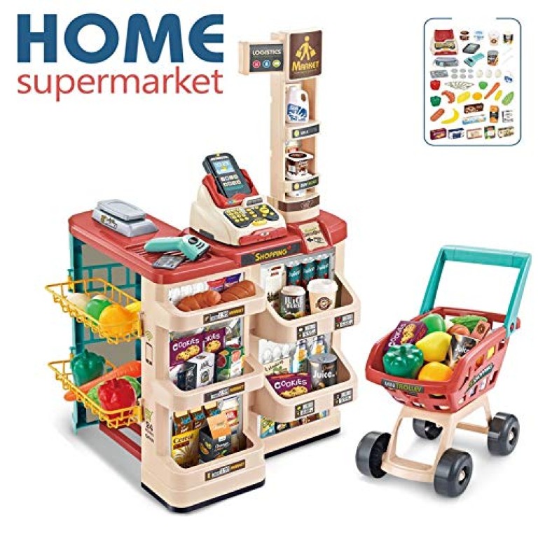سوبر ماركت مع عربة جمعية مع 48 قطعةعربة تسوق سوبر ماركت مع قطع هي لعبة تعليمية ممتعة للغاية ، سيحب طفلك اللعب مع الأصدقاء ، ويعلم الأطفال التجارة والبيع والشراء- لعبة المال- ماسح الباركود- -فواكه و خضروات- عربة جمعية