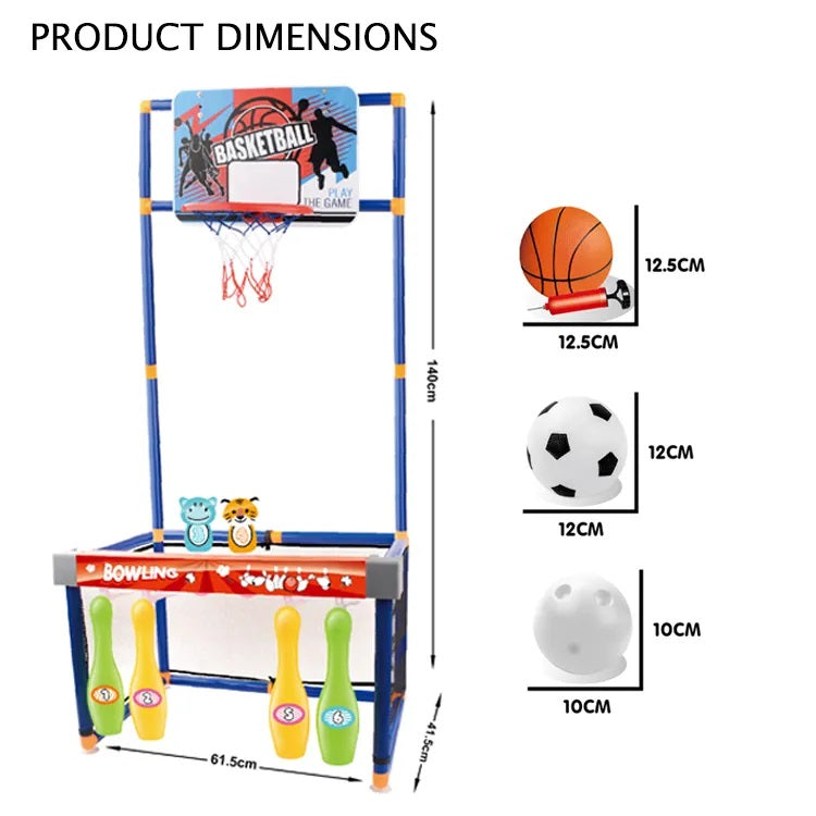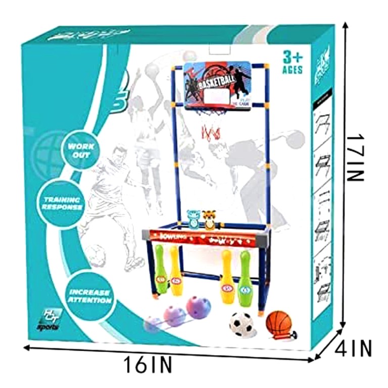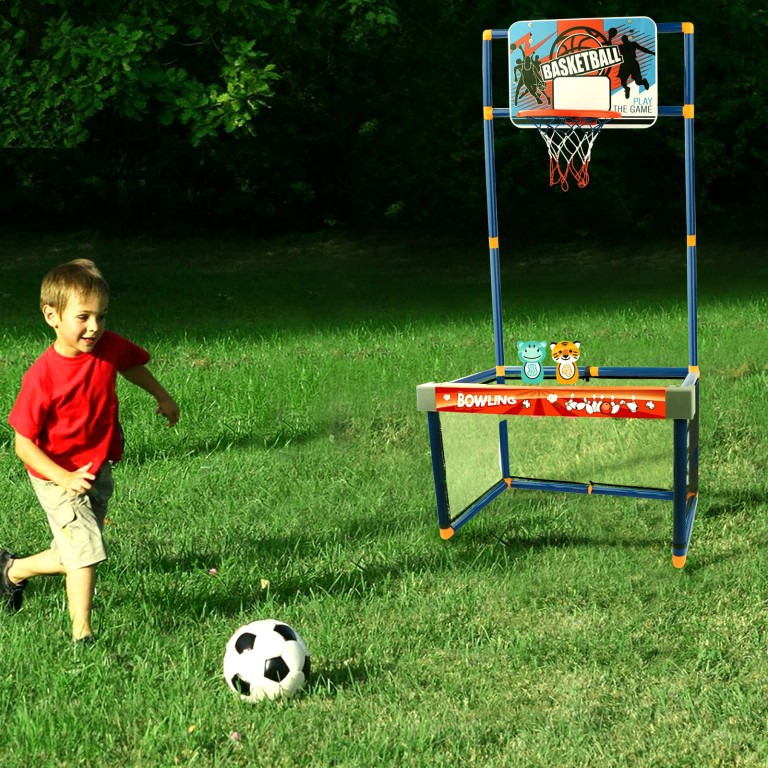 ستاند الالعاب 3 في 1 ستاند سلة كبيرمصنوع من البلاستيك الآمن على الأطفال سهل التركيبيمكن تثبيته بسهولةمع كرة سلة وكرة قدم و6 قطع بولينج وشبكة سلة و منفاخ صغير يتحرك إلى اليمين واليسار ليضيف جو من المتعة والتركيز على التصويب.