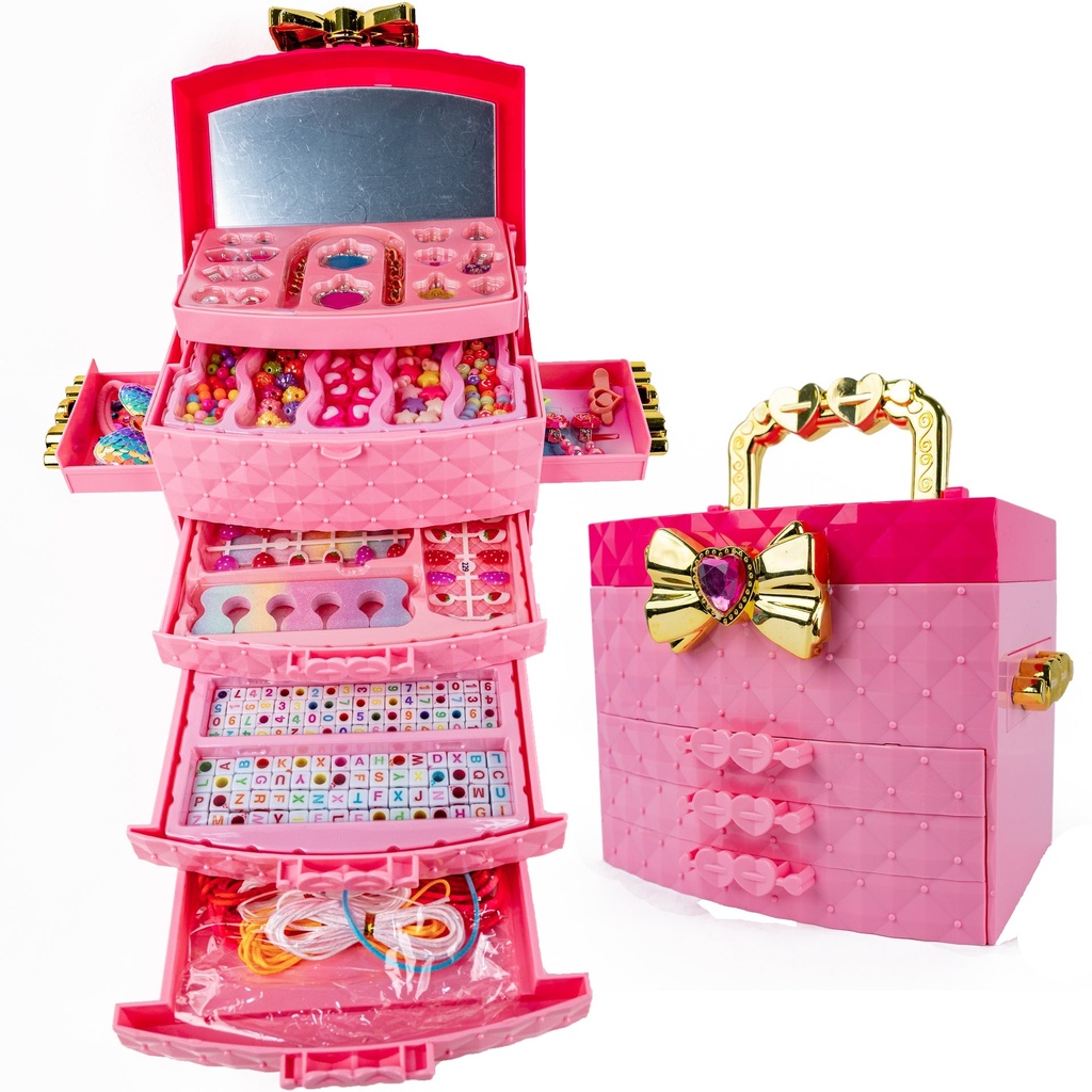 مرآة مدمجة: مزودة بمرآة داخلية لمساعدة الطفلة أثناء تجربة الإكسسوارات، مما يضفي تجربة واقعية لغرفة التجميل.
