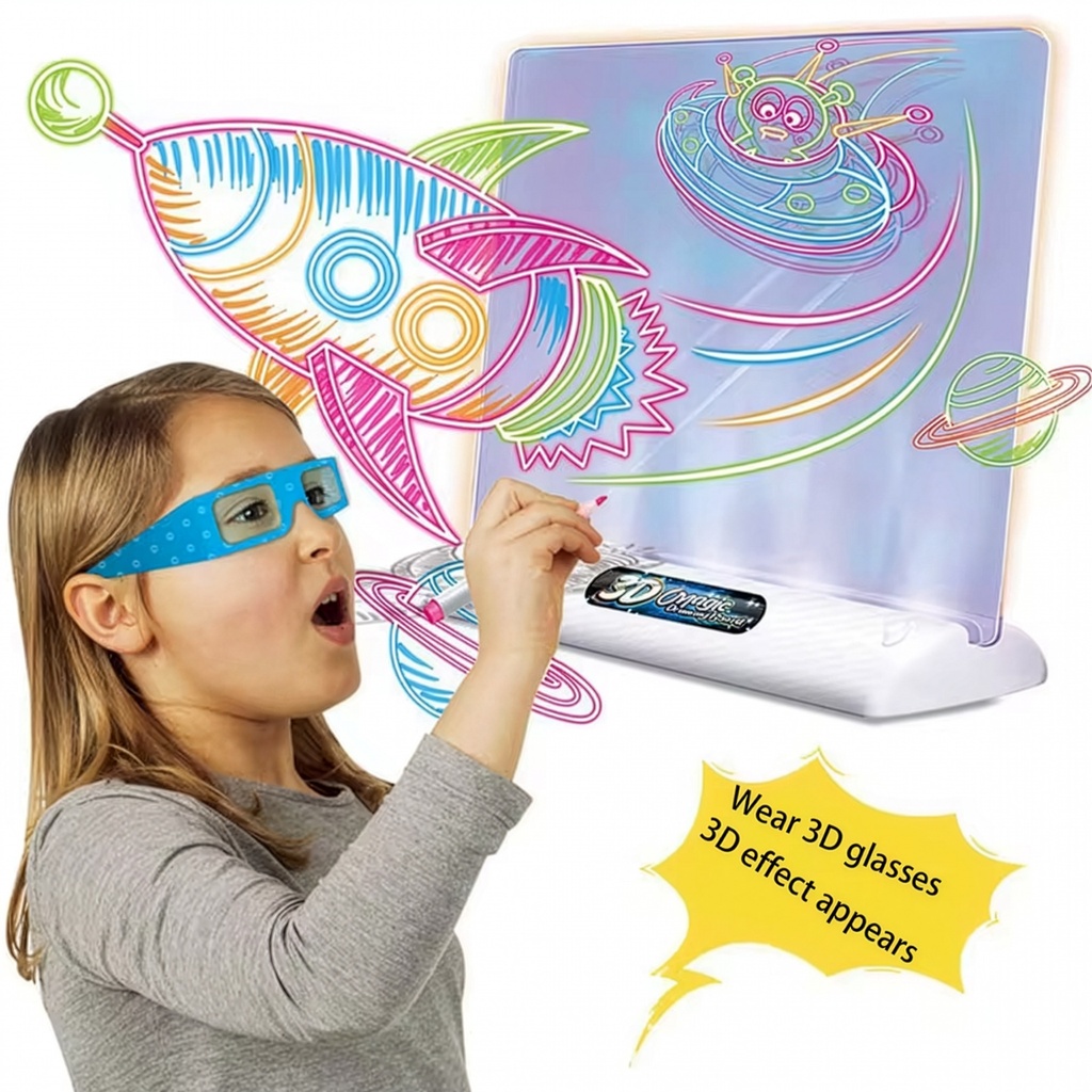 "لوحة الرسم السحرية ثلاثية الأبعاد (3D Magic Drawing Board)تجربة بصرية مذهلة: يأتي المنتج مع نظارات 3D خاصة تجعل الرسومات تظهر كأنها مجسمات حقيقية أمام عين الطفل.