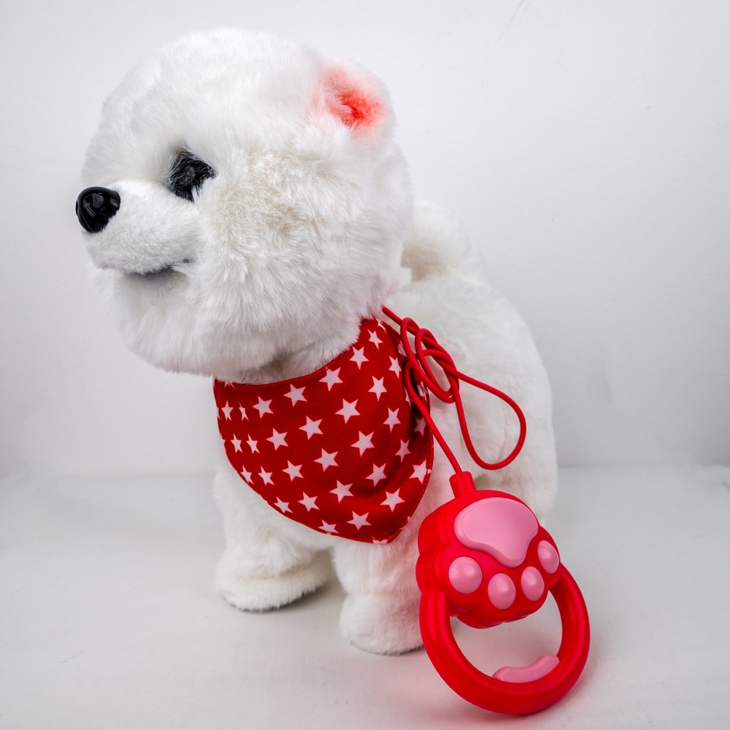 لعبة كلب أبيض تفاعلي بملمس ناعم، يتميز بوشاح أحمر أنيق وجهاز تحكم على شكل "مخلب" يتيح للطفل توجيهه للمشي والحركة بسهولة