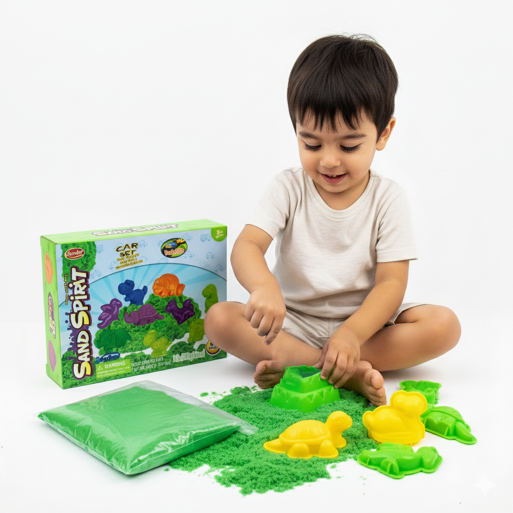 "لعبة الرمل السحري (Sand Spirit) باللون الاخضر الممتع، توفر للطفل تجربة حسية فريدة للعب بالرمل داخل المنزل بدون فوضى وتنمي مهاراته الإبداعية واليدوية.