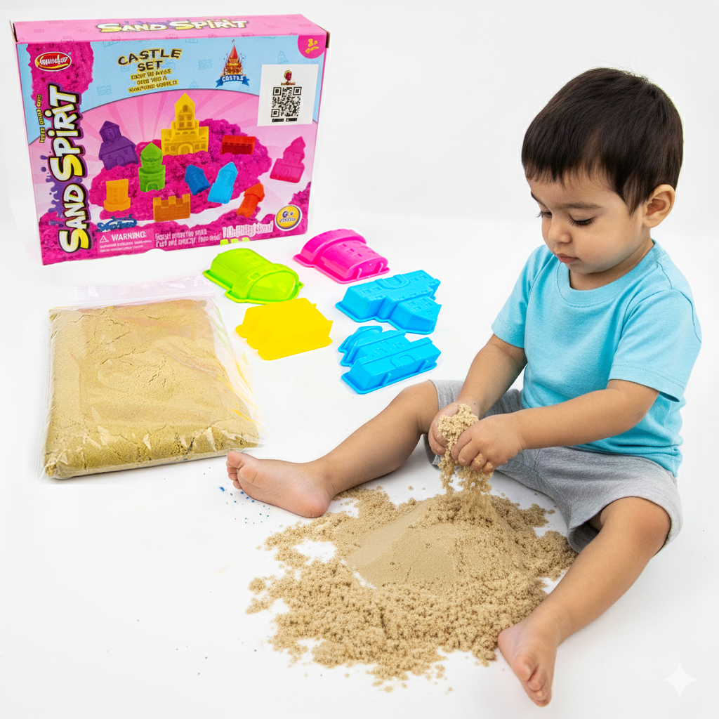 "مجموعة الرمل السحري (Sand Spirit) بلون الرمل الطبيعي، توفر تجربة بناء وتشكيل ممتعة داخل البيت وكأنكم على الشاطئ، وتساعد على تنمية مهارات الطفل اليدوية وخياله الإبداعي.