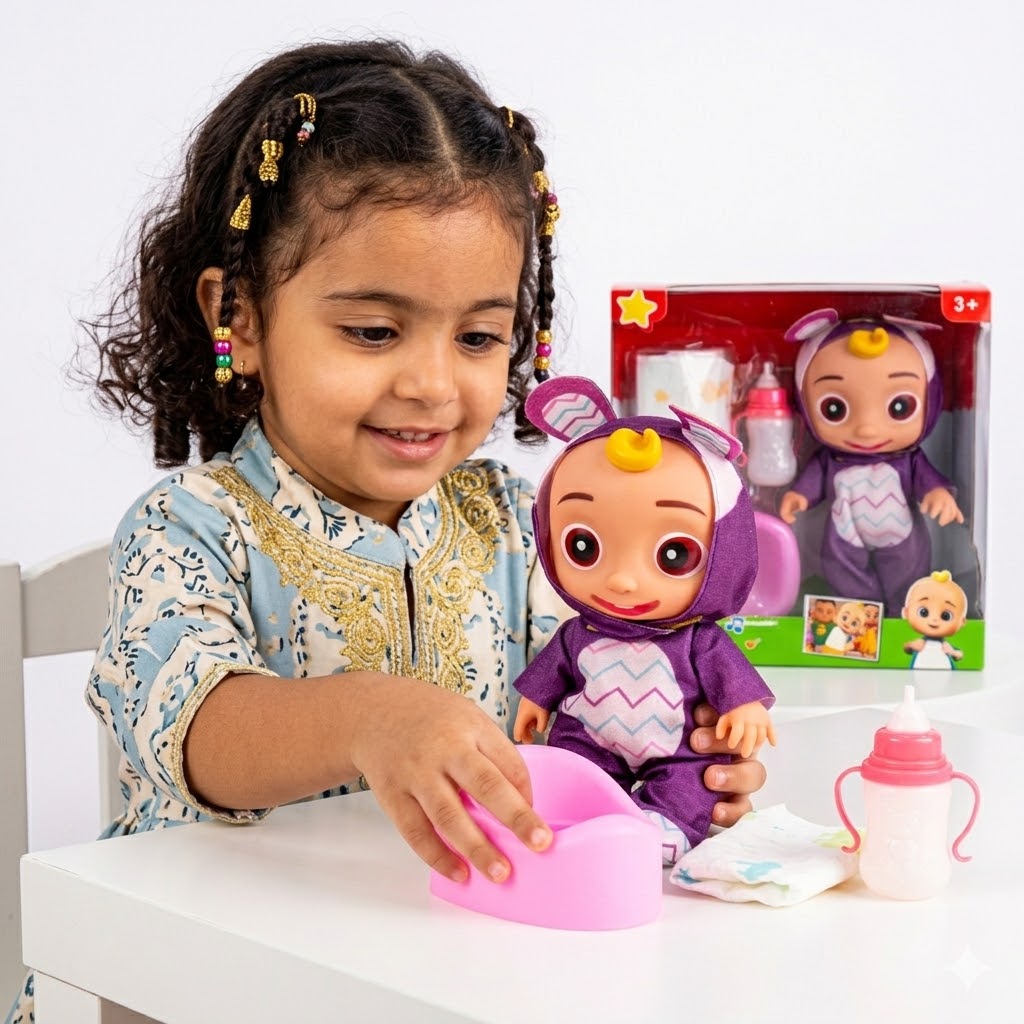 دمية تفاعلية للأطفال تأتي باللونين الأزرق والبنفسجي، وتتضمن ملحقات للعناية: نونية وردية، زجاجة رضاعة، وحفاضة قماشية.