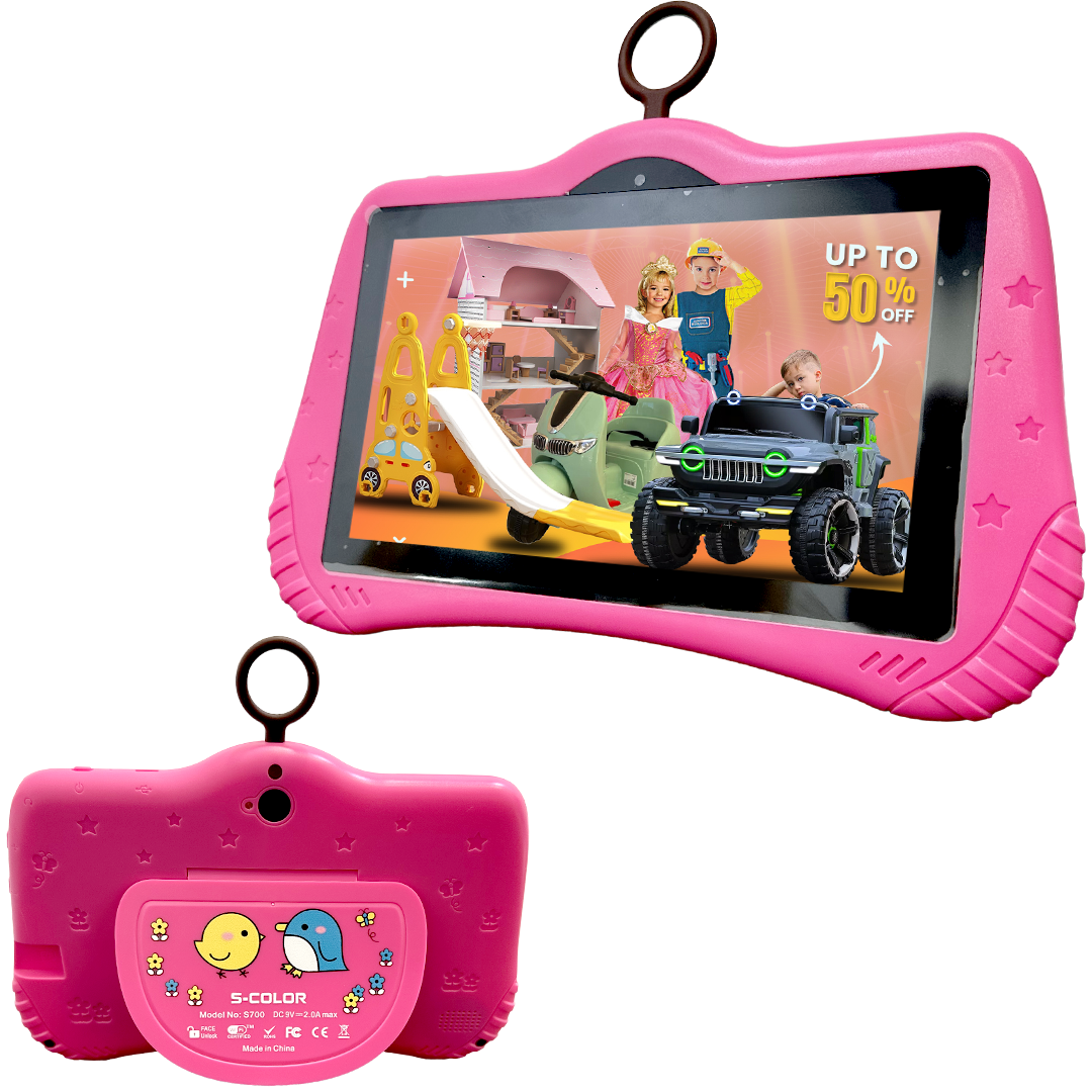 Children's tablet 7 inches Available in different colors (pink - tiffany - yellow) Large battery, longer duration of 5000 m 2MP + 13MP camera LCD screen Storage space is 128 GB 6 GB RAM Wi-Fi + Android + Bluetooth AUX input Front and back camera Free gift Touch pen for screen sharpener pencil Whistle attachments USB charger 3d glasses