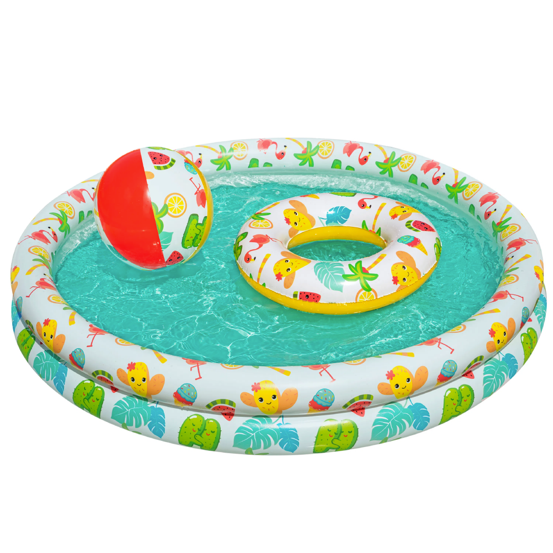 3in1 SET - inflatable included paddling pool with dimensions of 122cm x 20cm. Additionally It comes with two inflatable toys . The inflatable ball with a diameter of 27 cm is suitable for use both in water and on the ground. In order for the little novice swimmer to make friends with the water faster, the set also includes a swimming circle with a diameter of 46 cm