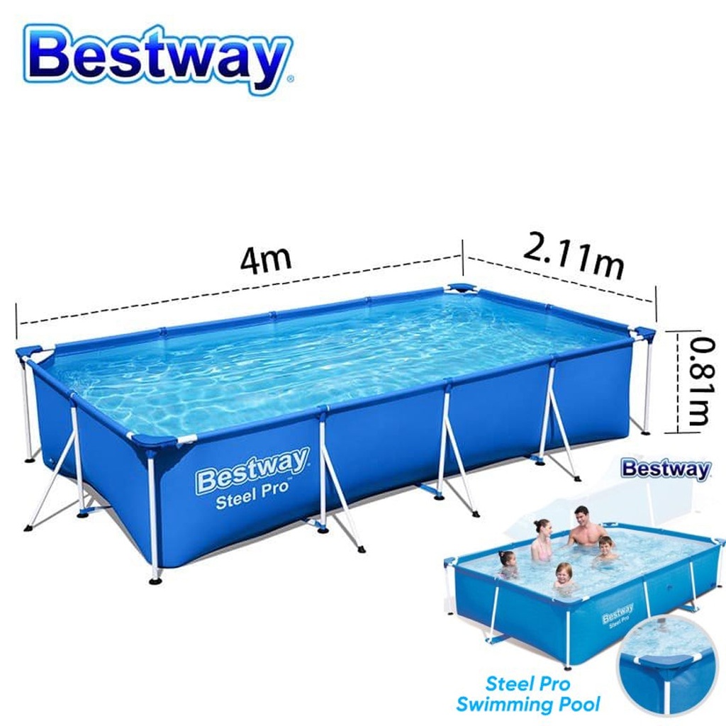 Rectangular Pool Installation Brand: Bestway Dimensions: 4.00m x 2.11m x 81cm Water Capacity: 5,700 liters (1506 gallons). Easy Step-Up Corrosion-Resistant Metal Frame Heavy-Duty Triple-Layer PVC and Polyester Sidewalls Built-in Flow Control Drain Valve Makes Draining Easy by Connecting the Valve to a Garden Hose (with Included Adapter) to Drain Water Away Underwater Adhesive Repair Patch The extra-strong sidewalls of this pool are constructed using Tritech™, a three-layer reinforced material with a polyester mesh core sandwiched between two layers of high-gauge PVC. This results in an overall thickness of 0.40-0.80mm (16-32 gauge) depending on the pool size, providing superior strength and durability. Includes one full-color pool box.