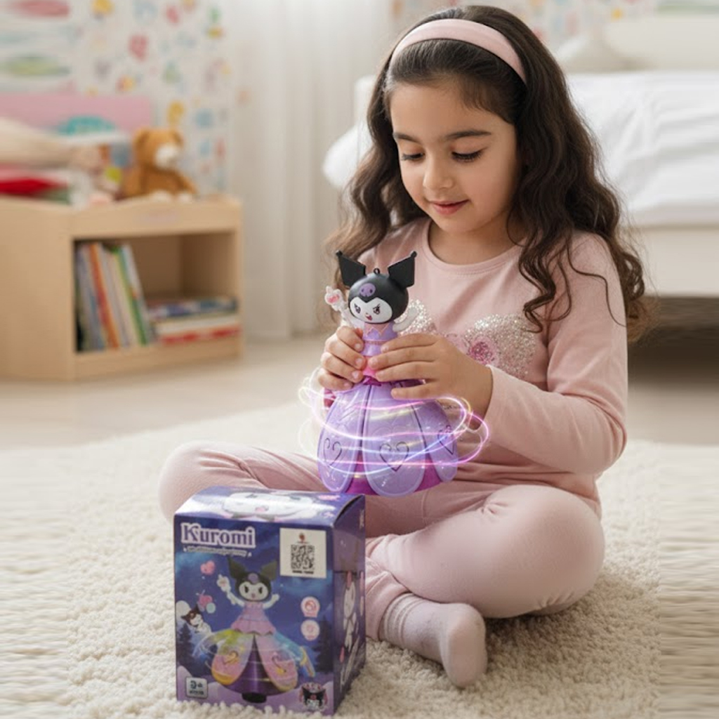 Dancing Kuromi Doll Musical & Motion Fun: An interactive doll that dances and moves to delight kids. Bright Light Effects: Integrated lights for a vibrant and engaging play experience. Charming Design: Features the iconic Kuromi look with a beautiful purple gown.