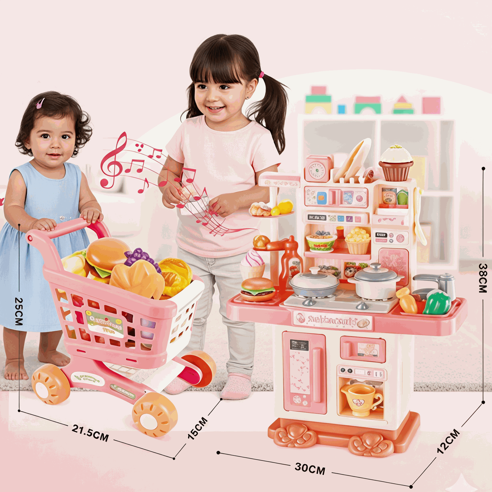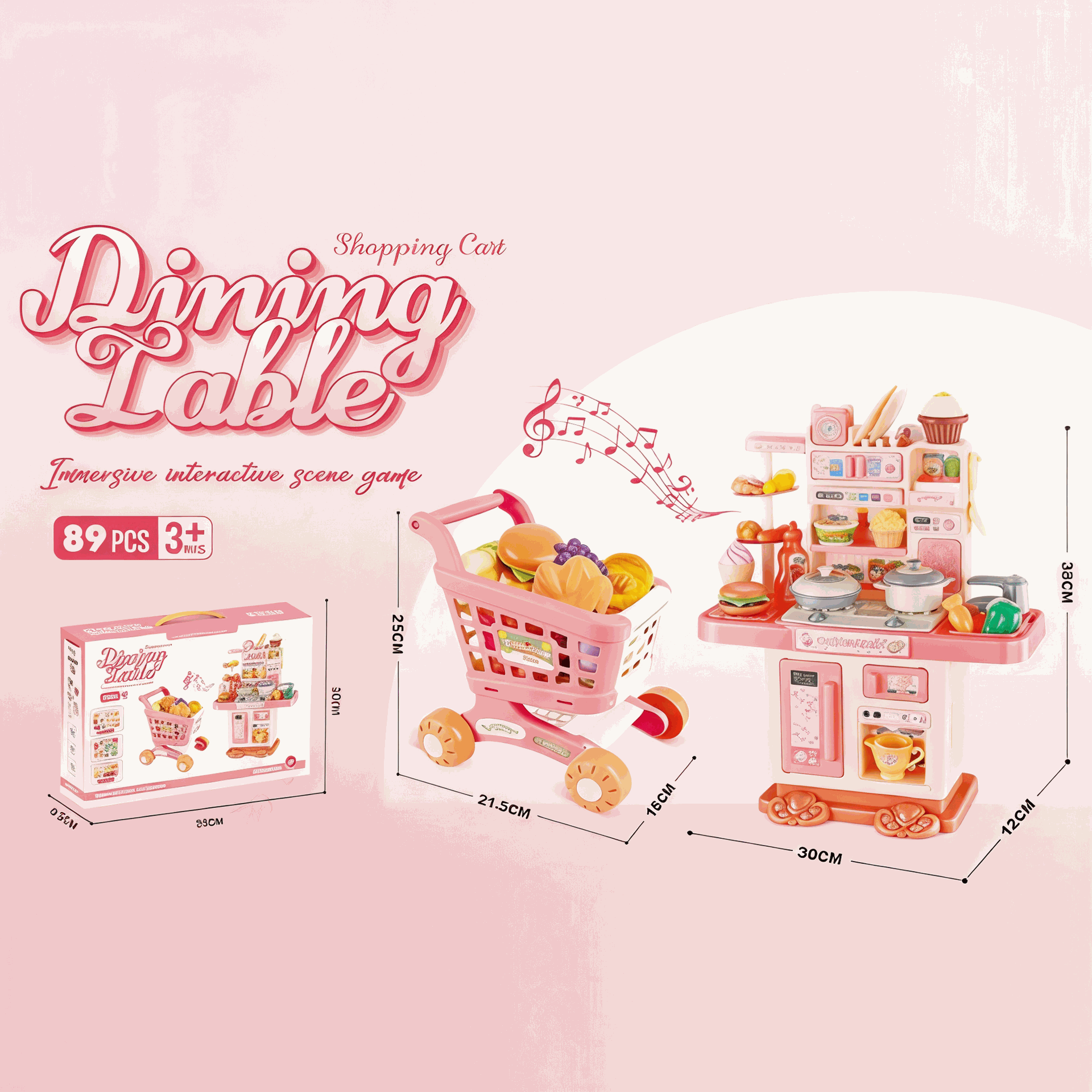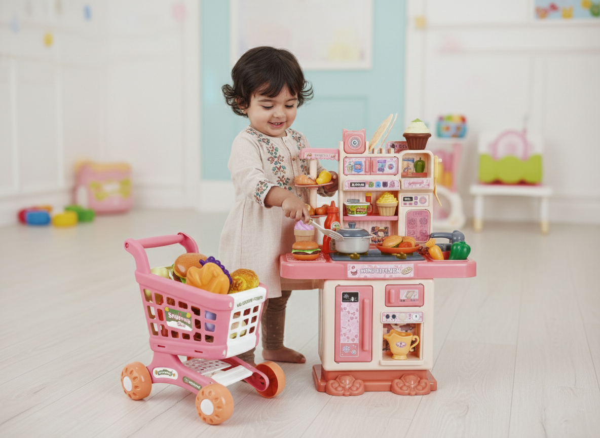 Equipped with a variety of tableware, plates, and cups, allowing the child to role-play preparing and eating food. Also includes a mobile shopping cart: designed with realistic details, a push handle, and wheels, which the child can push.