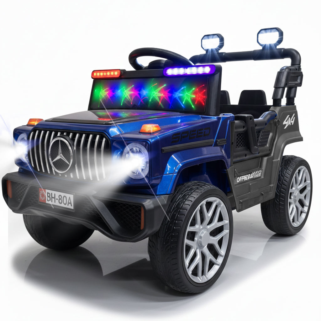 Interactive Sound System: Features built-in songs and music, along with realistic engine startup sounds for an immersive experience. Stunning Light Show: Equipped with a colorful LED light bar on the windshield, rooftop spotlights, and powerful headlights. Premium Design: A glossy royal blue finish, sleek silver rims, and the classic Mercedes emblem combine luxury with durability. High Performance: A sturdy 4x4-style build designed for stability, making it the perfect gift for young explorers.