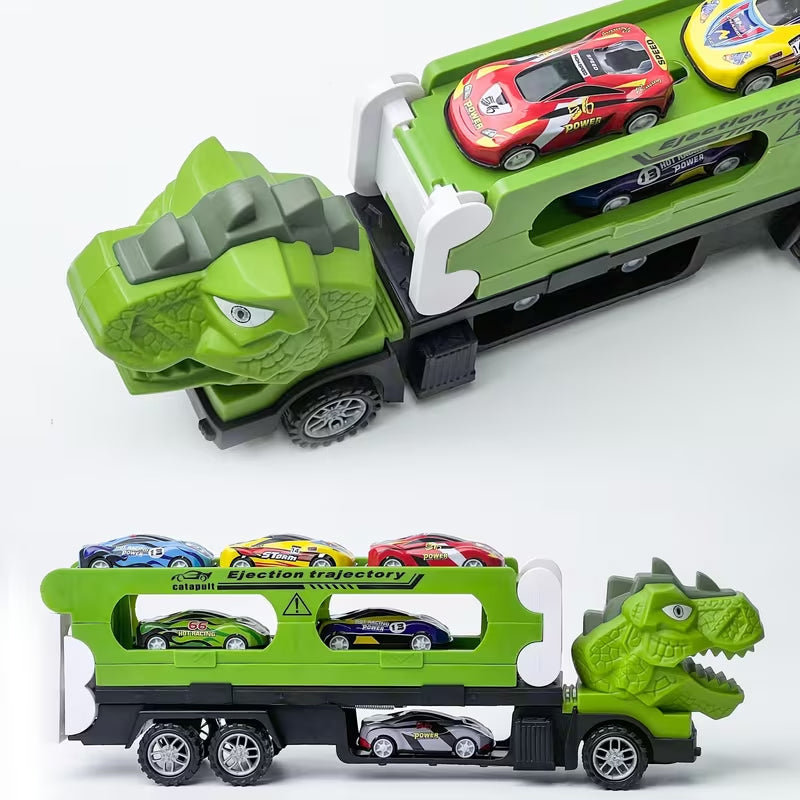 Dinosaur & Speed Adventure: A giant dinosaur-themed truck that combines the love for prehistoric creatures with the thrill of car racing, featuring a lightning-fast car ejection mechanism. Product Components: The set includes a large double-decker transport truck for storing and carrying cars, along with a collection of colorful mini racing cars ready for action. Excitement & Challenge: Provides hours of fun with its built-in car launcher, helping children organize their toys inside the truck while developing motor skills in an exciting way.