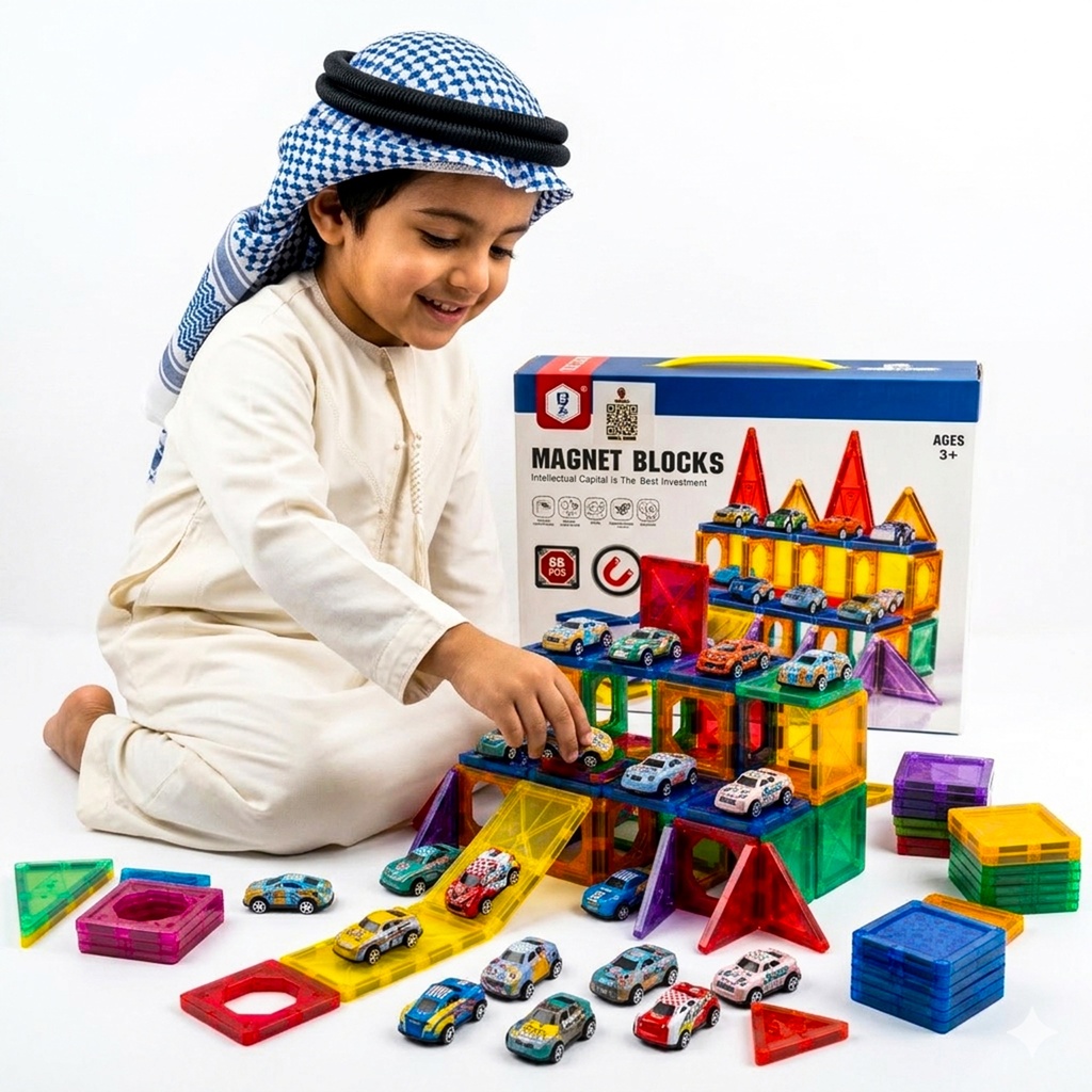 This comprehensive 68-piece magnetic block set (ages 3+) features colorful building tiles and miniature toy cars, perfect for designing creative cities and race tracks.