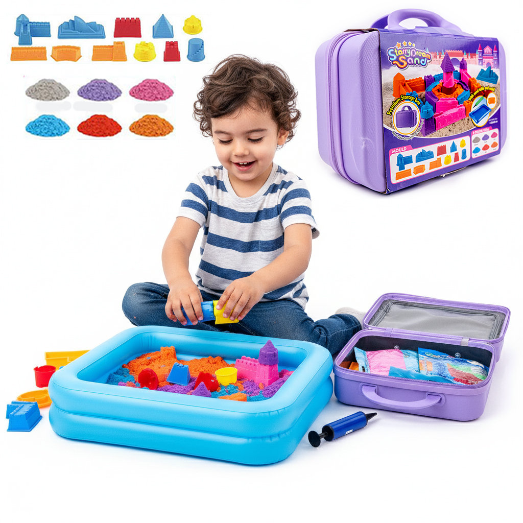 This magical sand set provides a creative and engaging experience for children aged 3 and up, featuring soft, non-stick, and non-drying colorful sand, complete with an inflatable play tray, a pump, and a variety of molds to build castles and imaginative shapes with ease and cleanliness.