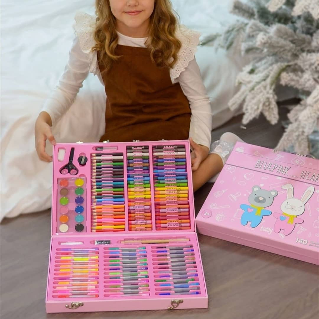 هذه الحقيبة المميزة تحتوي على 152 قطعة متنوعة من الألوان والرسومات، مما يجعلها الهدية المثالية للأطفال الذين يحبون الرسم والتلوين