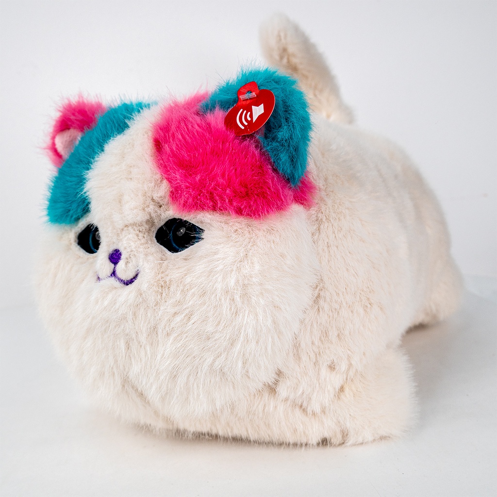 قطة محشوة فائقة النعومة تتميز بألوان زاهية (وردي وفيروزي) على الرأس، وتتضمن ميزة إصدار أصوات تفاعلية عند اللمس على الرأس او الظهر او الايد