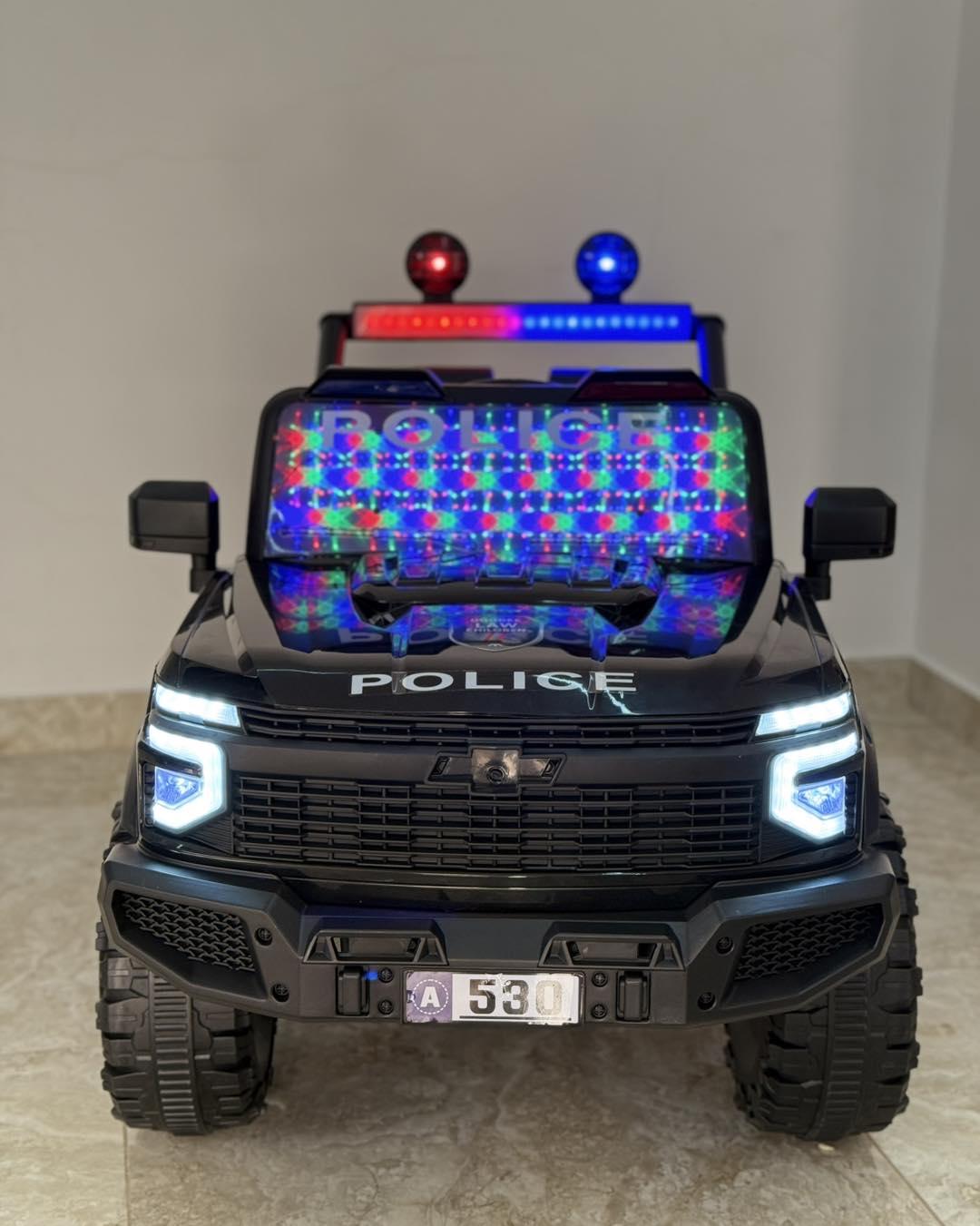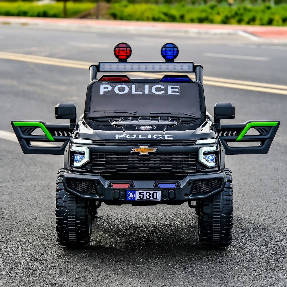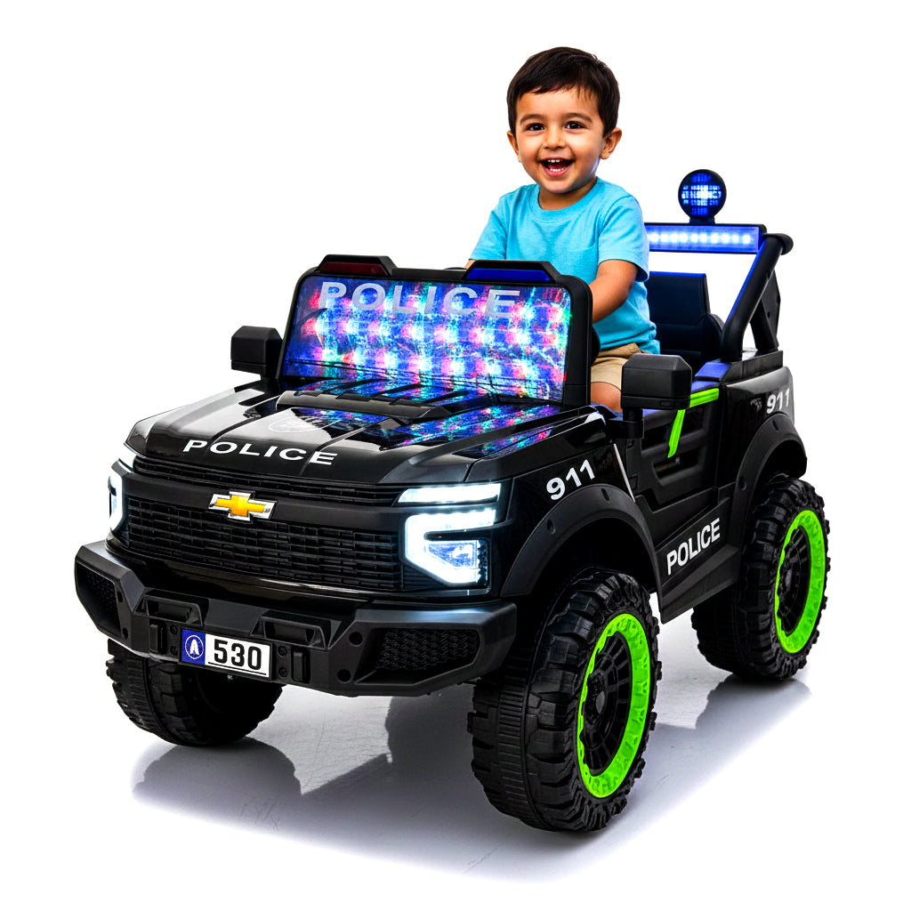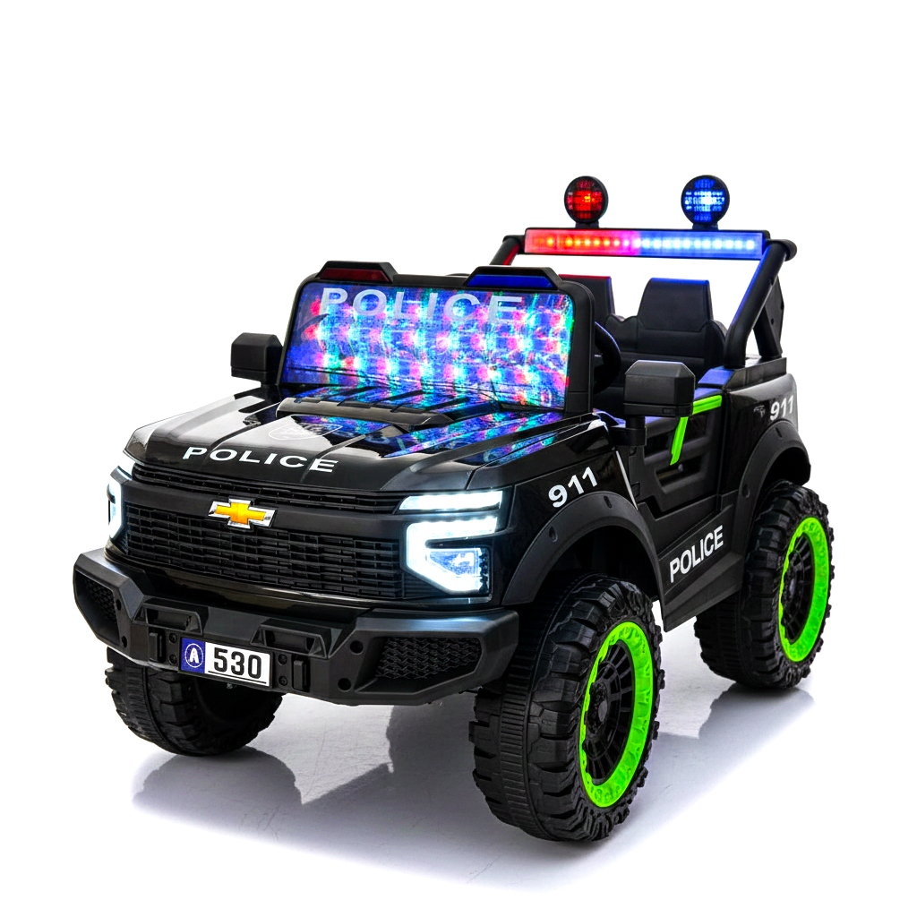 سيارة شرطة كهربائية دفع رباعي للأطفالمؤثرات واقعية: مزودة بأنوار شرطة ملونة (Flashing Lights)، أصوات محرك، ومجموعة من الأغاني والموسيقى المدمجة.تصميم هجومي قوي: هيكل أسود فخم يحمل شعارات الشرطة ورقم الطوارئ "911"، مع إضاءة LED أمامية وخلفية مبهرة.ثبات على جميع الطرق: عجلات ضخمة مخصصة للمناطق الوعرة مع حواف باللون الأخضر الفسفوري تضمن التوازن والمتانة.ترفيه متكامل: نظام صوتي داخلي لجعل وقت اللعب أكثر حيوية وتفاعلاً.