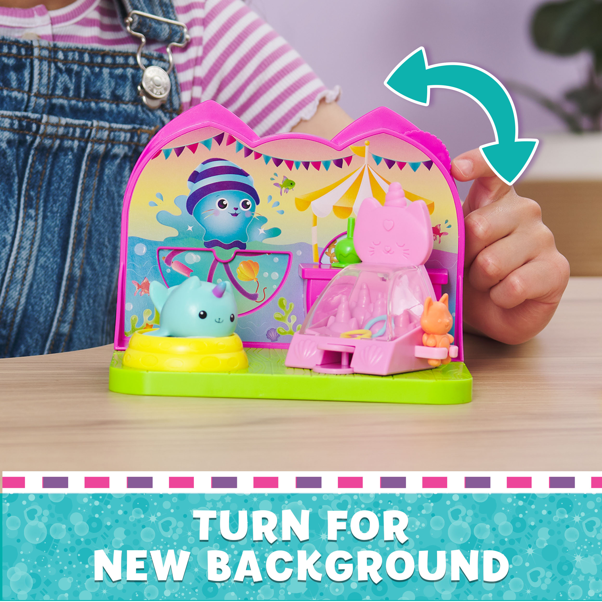 CARNIVAL-THEMED DOLLHOUSE ROOM: Place Kitty Narwhal in the ball pool or try your luck at the super-cute ring toss game, to try and win a prize, then turn the thumbwheel to enjoy a change of scenery!