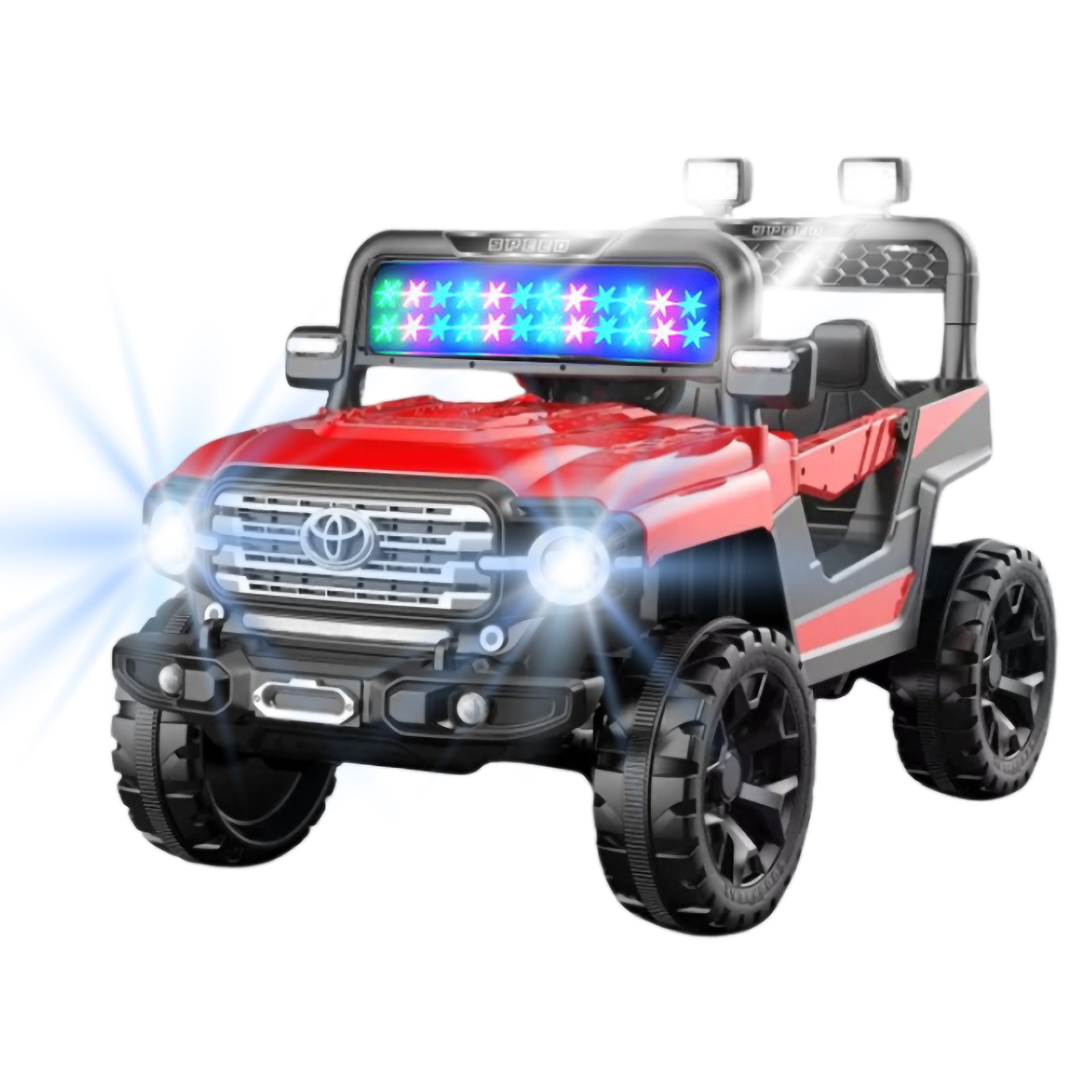 Toyota class jeep car for children It has a sleek and sturdy design, with subtle details that mimic the real thing. Available in blue and red Provides a fun and safe driving experience, making it perfect for kids who love outdoor exploration and adventure. Features: Remote control 12 volt Maturin Openable doors headphones Front lights Safety belt