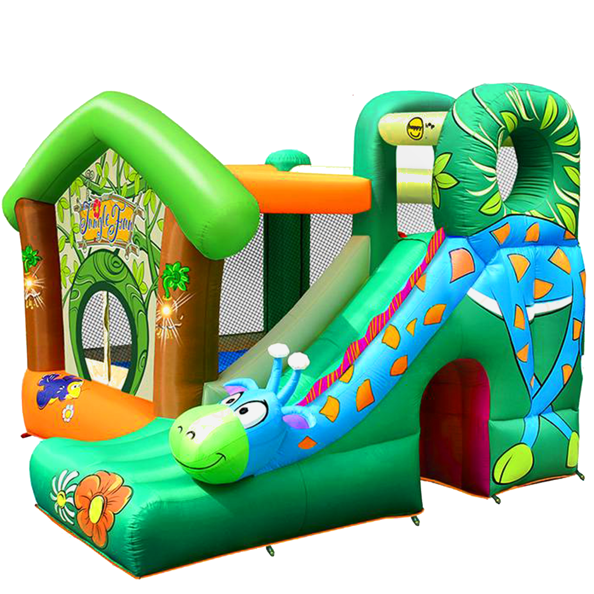 Hopper Jungle Art (Jungle Fun) The cheerful giraffe is made with original design and bright colors. Suitable for home use and rental. The play complex includes a slide that children will love. Larger trampoline jobs will be provided with the possibility of climbing the wall and crawling through the tunnel. For sports fans there is a basketball collar. Trampoline games are completely safe thanks to the safety net. Trampolines are easily installed (within 10-15 minutes) using a special blower.