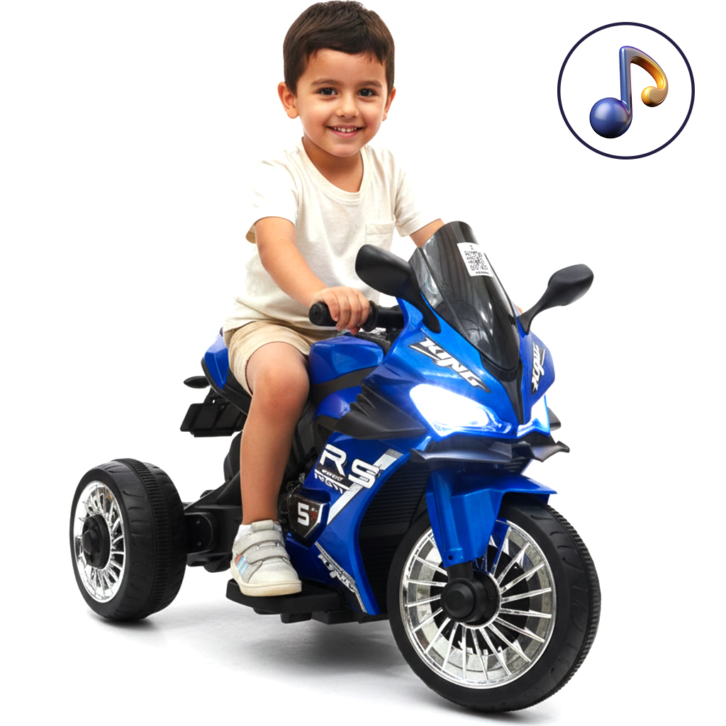Electric Sport Trike for Kids Powerful LED Headlights: Give the bike a modern, realistic look while lighting up the way for fun adventures. Built-in Music System: Equipped with delightful sound effects and music to add a layer of joy during the ride. Rechargeable Battery: Includes a dedicated charger and a high-performance battery to ensure longer playtime. Stable 3-Wheel Design: Features a smart 3-wheel build for maximum sشtability and to prevent tipping. Stunning Sporty Details: Available in vibrant colors (Blue & Pink) with realistic designs that mimic actual motorcycles.
