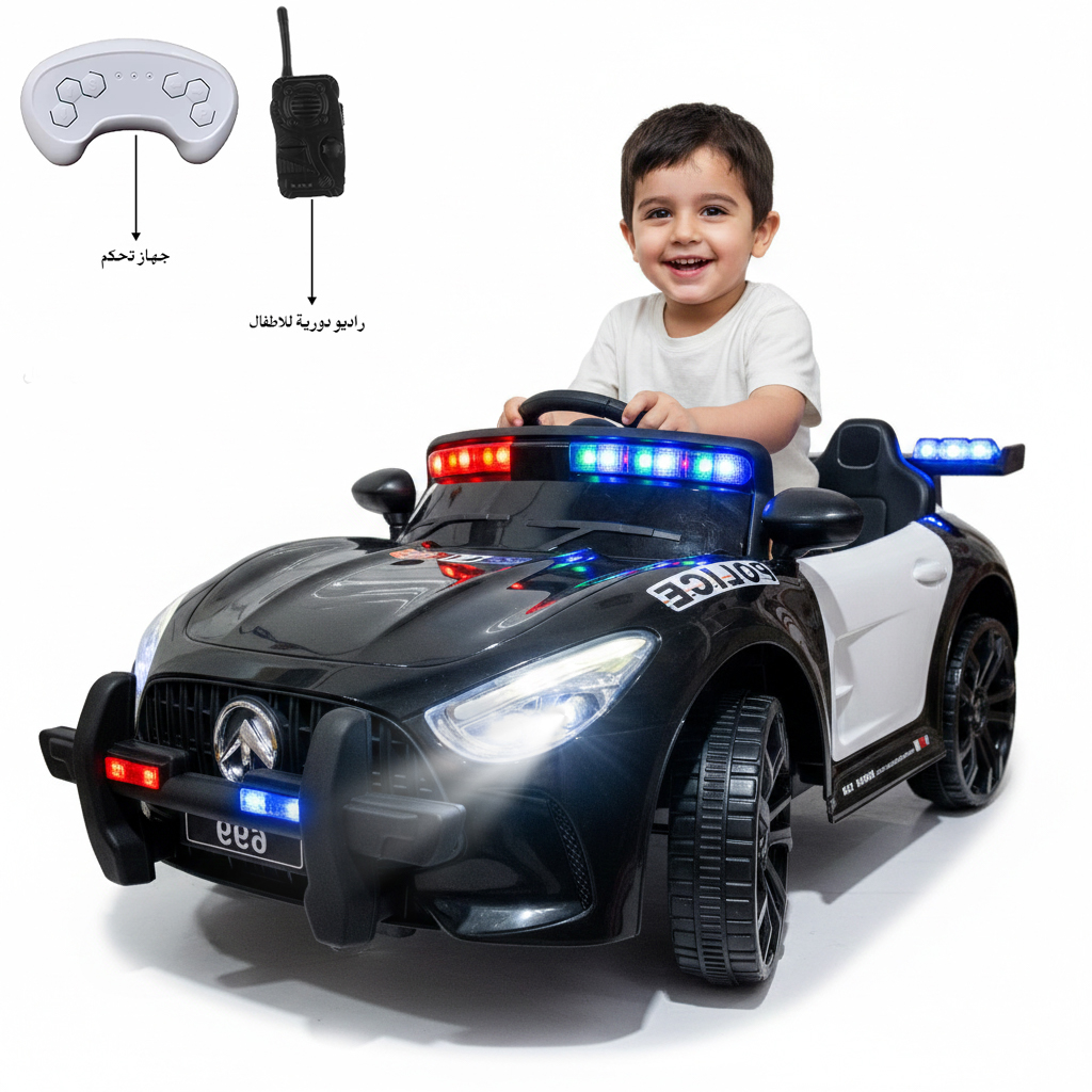 A fun electric police car for kids, equipped with realistic emergency lights and a walkie-talkie, featuring a parental remote control to ensure safety while they enjoy the ride.
