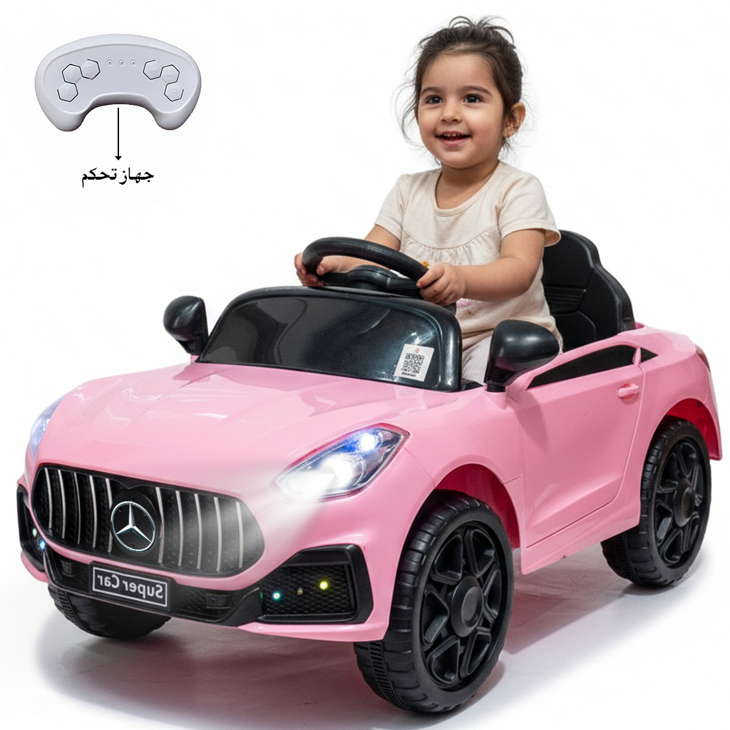 A stylish and fun ride-on car for kids, featuring bright LED headlights and a durable body, available in four vibrant colors: White, Pink, Red, and Yellow. It offers both manual steering for the child and a remote control for parental safety, along with a comfortable seat and a realistic sporty design