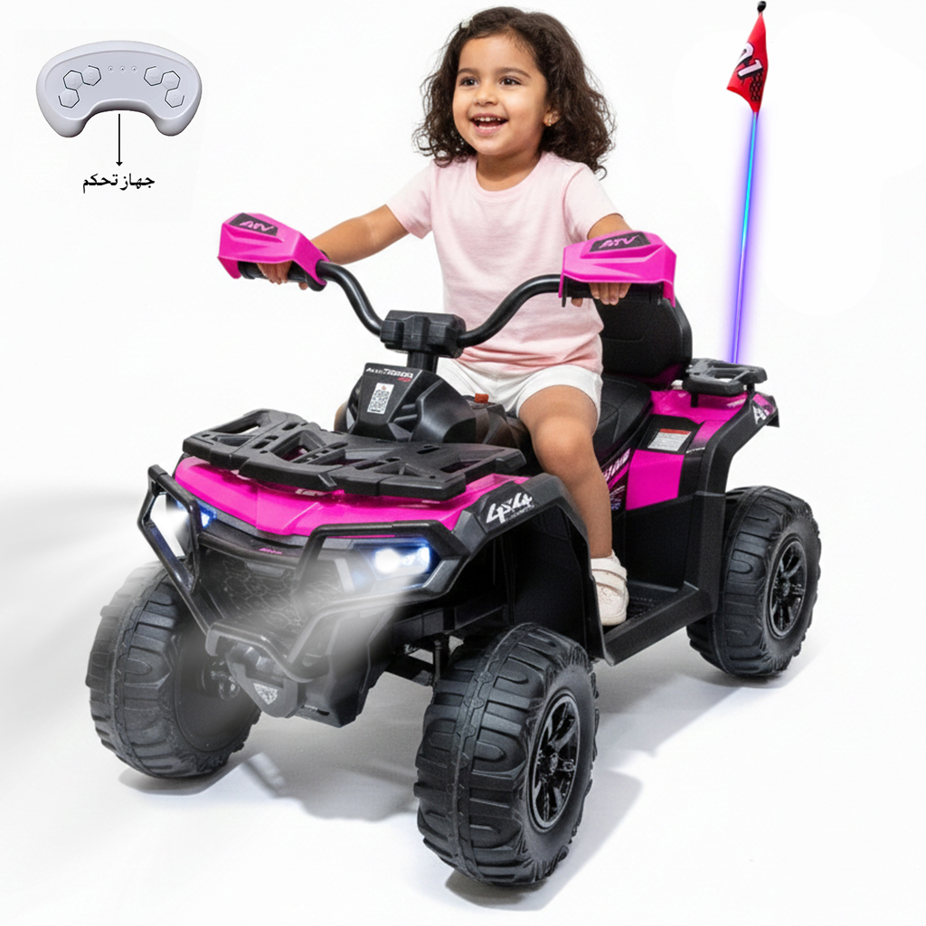 Electric kids' ATV with a realistic and sturdy design, featuring front LED lights and a remote control for parents. It comes with large off-road tires and is available in two vibrant colors: Blue & Black and Pink & Black.